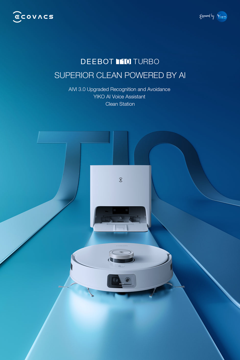 With enhanced AIVI 3.0 technology, first-of-its-kind YIKO voice assistant, top-of-the-range TrueMapping navigation and the OZMO™ Turbo 2.0 Oscillating Mopping System, DEEBOT T10 TURBO delivers your cleaning needs whatever the environment.