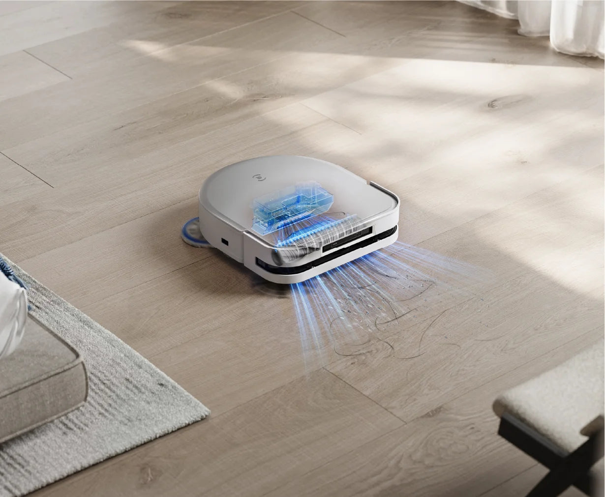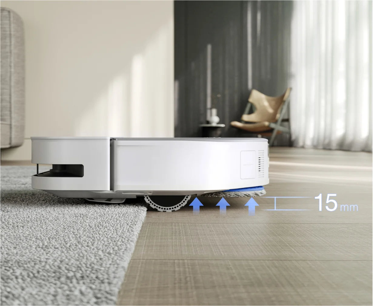 With 15mm Auto-lift Mopping, DEEBOT X5 PRO OMNI intelligently adjusts when encountering carpets, automatically lifting the mopping pad to prevent wetting while increasing suction power to effectively vacuum hidden dust, ensuring thorough cleaning and preventing secondary contamination.